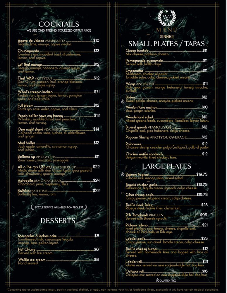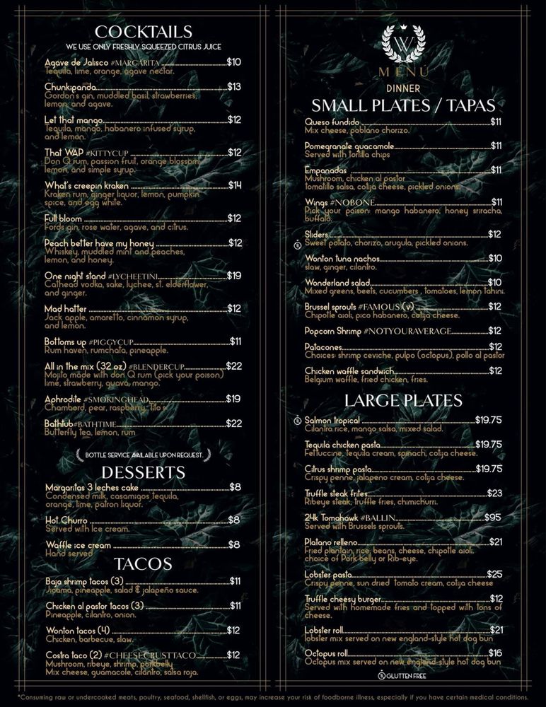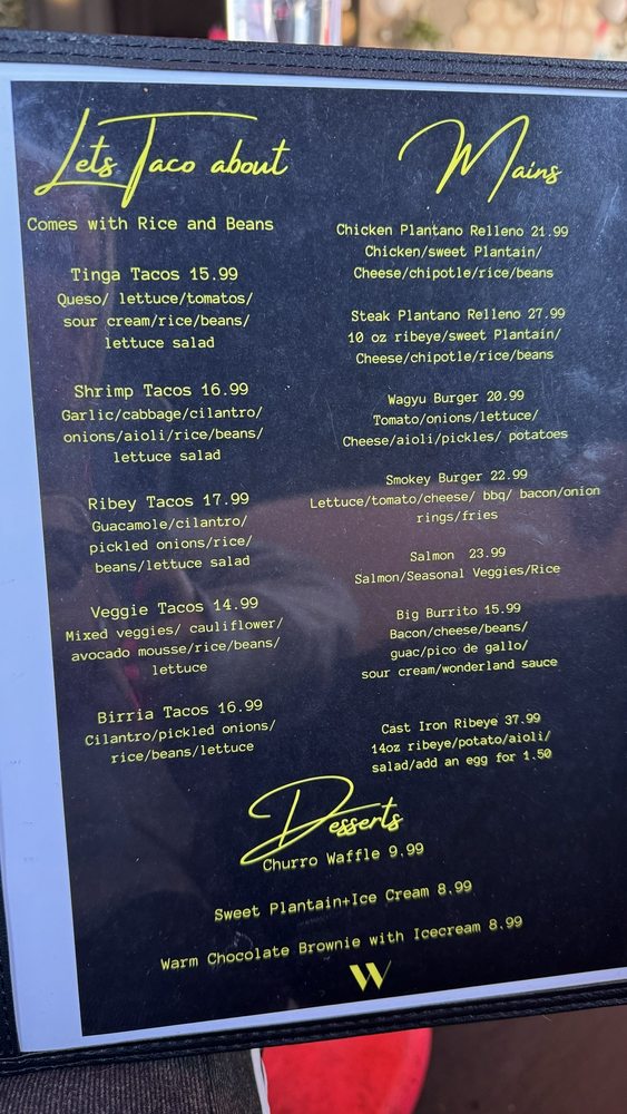 Wonderland Tapas in Raleigh, NC offers a trendy and casual atmosphere for enjoying tapas and cocktails. With a diverse menu featuring dishes like Bone In Pork Chop Carnitas and Tequila Chicken Pasta, guests can savor unique flavors in a hip setting. The desserts, such as Waffle Ice Cream, provide a sweet ending to the meal. The friendly staff, like waitress Yolanda, adds to the welcoming vibe of the restaurant. While the location may be a bit hidden, the culinary experience at Wonderland Tapas is worth the search. Whether you're looking for a laid-back brunch or a lively evening with friends, this spot offers a delightful dining experience.